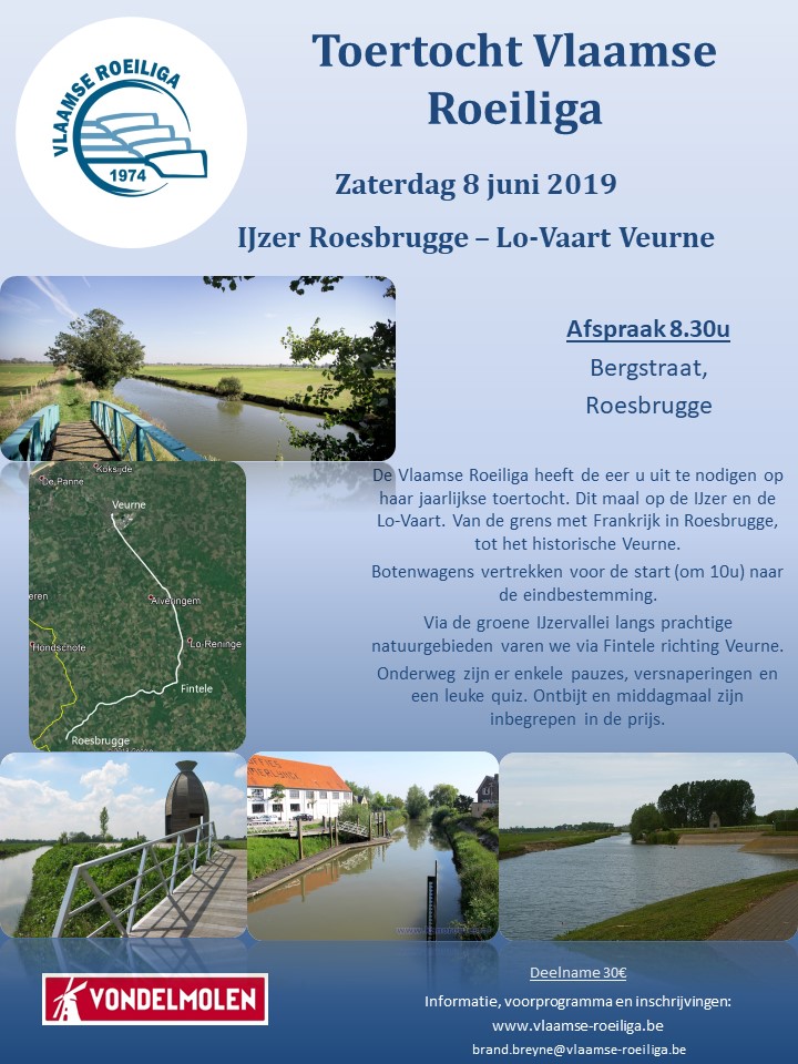La Vlaamse Roeiliga organise sa randonnée annuelle le samedi 8 juin. Cette année, on rame sur l’Yser et le Lo-vaart de Roesbrugge à Furnes.